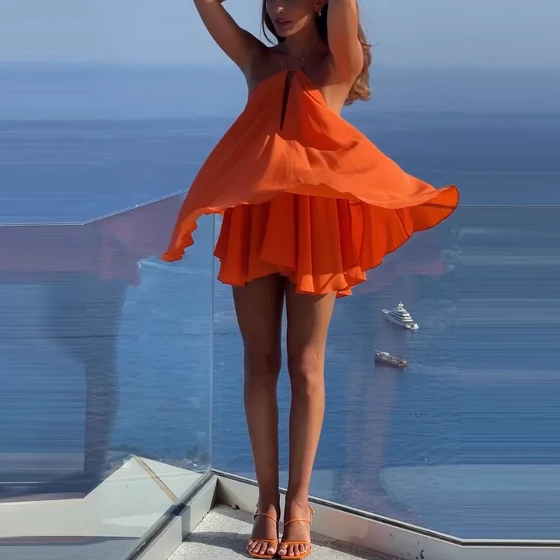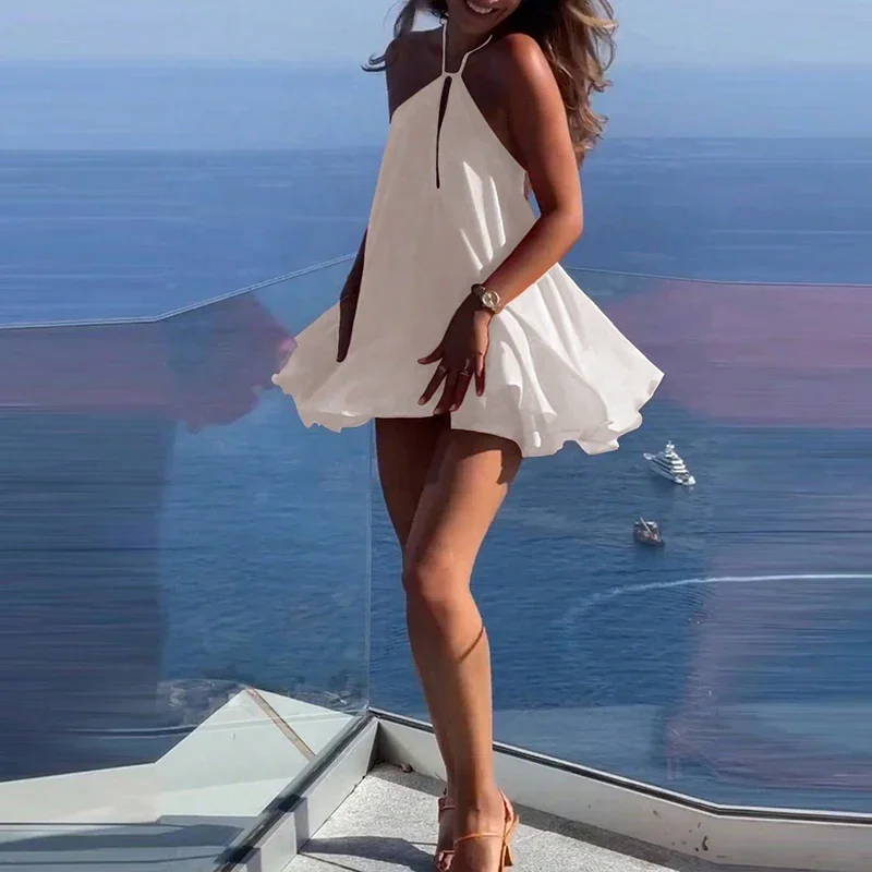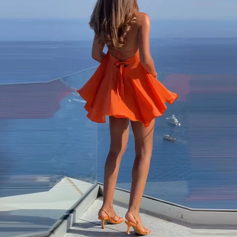 Sexy Elegant Hanging Neck Sleeveless Backless Mini Dress Women Fashion Cross Backless Pleated Beach Dresses Holiday Clothing
