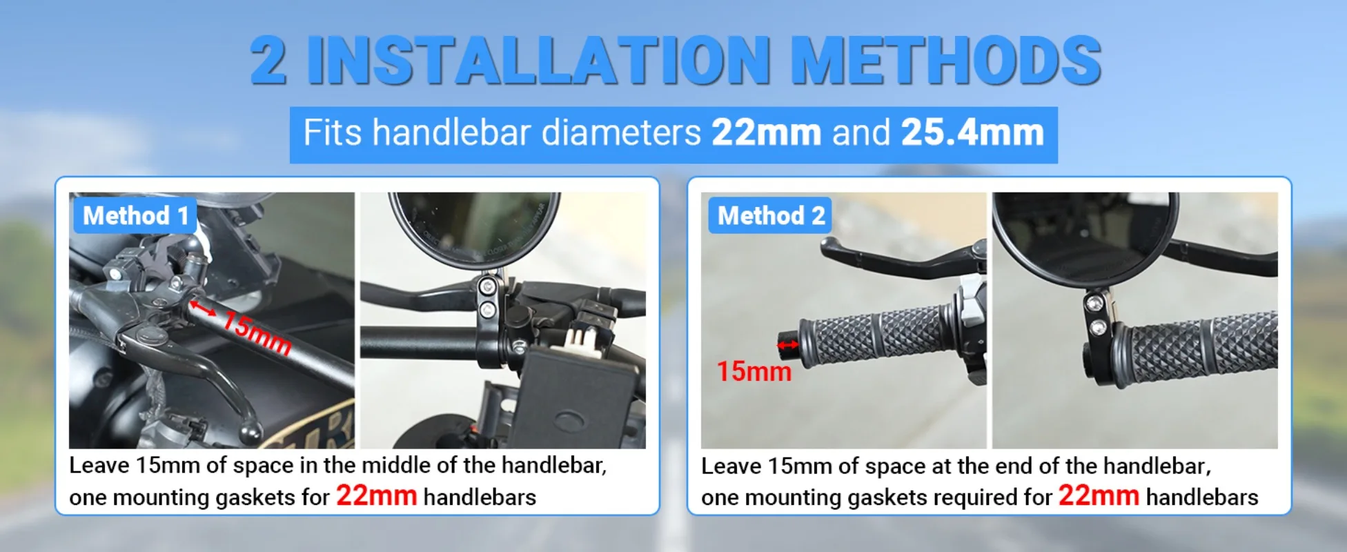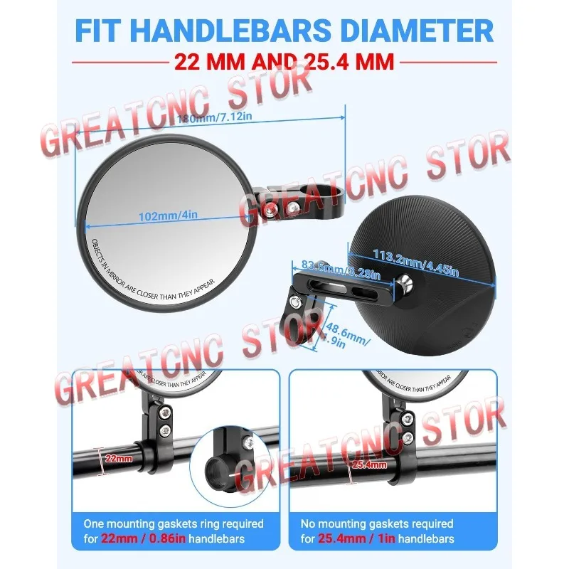 - 【Wide Compatibility】Motorcycle Mirrors Round fits handlebars diameters of 22mm / 0.87inches and 25.4mm / 1inch and includes two mounting gaskets, making it suitable for most motorcycle and street bike brands. Please note: for 22mm handlebars, the gaskets are required. Please measure the diameter of the handlebar before purchasing.