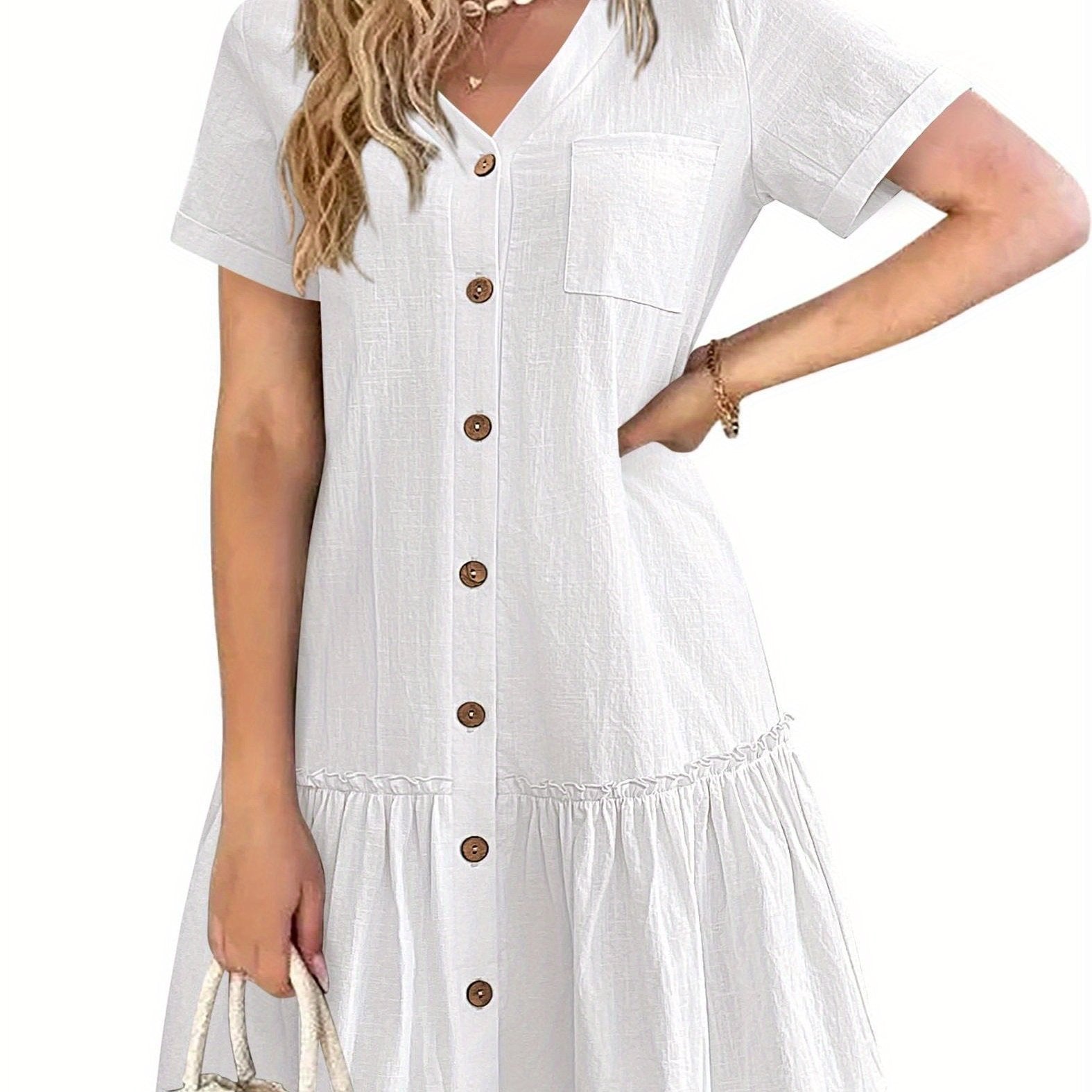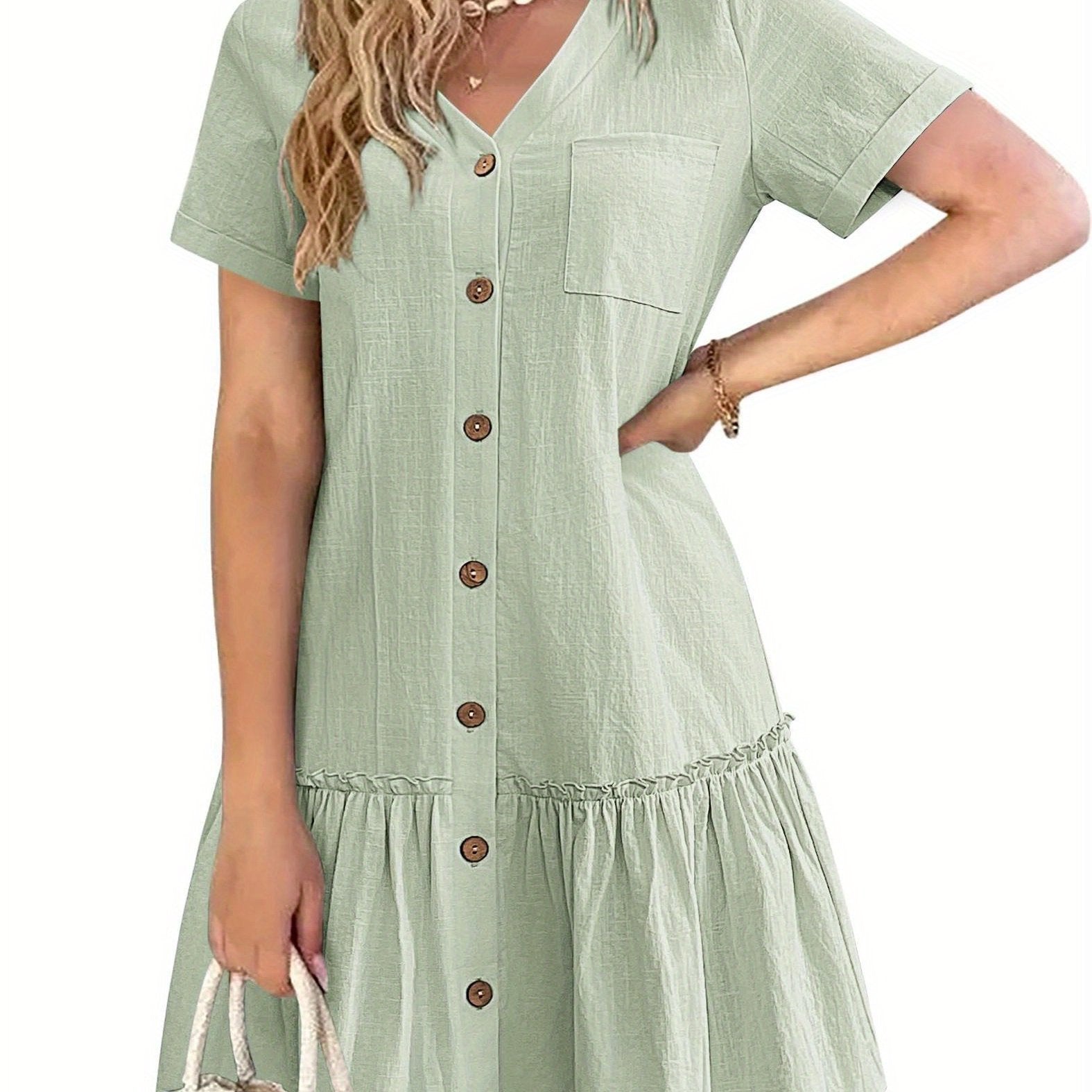 Women's Casual Short Sleeve Button- Dress with Ruffle Hem - Lightweight 300gsm V-Neck Tunic Shirt Dress, Machine Washable Summer Dress for Beach Outings & Casual Wear, Summer Casual Dress | Ruffle Hem Dress | Breathable Fabri
